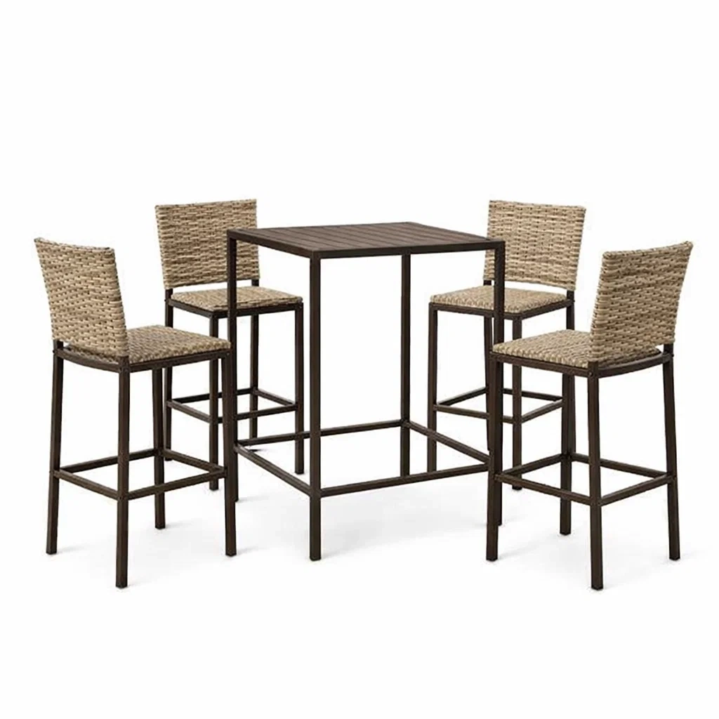 - Chaises : structure en métal, siège et dossier en résine tressée